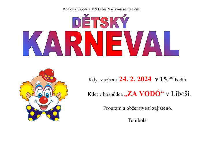 Rodiče z Liboše a MŠ Liboš Vás zvou na tradiční DĚTSKÝ KARNEVAL