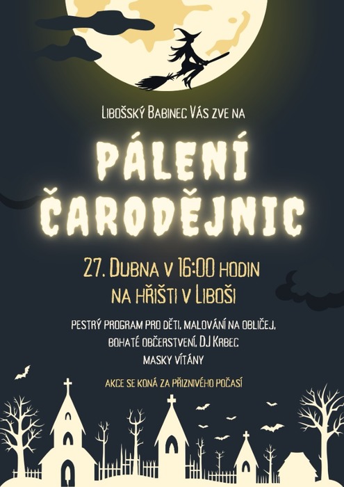 Libošský babinec Vás zve na PÁLENÍ ČARODĚJNIC v sobotu 27. dubna od 16:00 hod. na hřišti v Liboši.