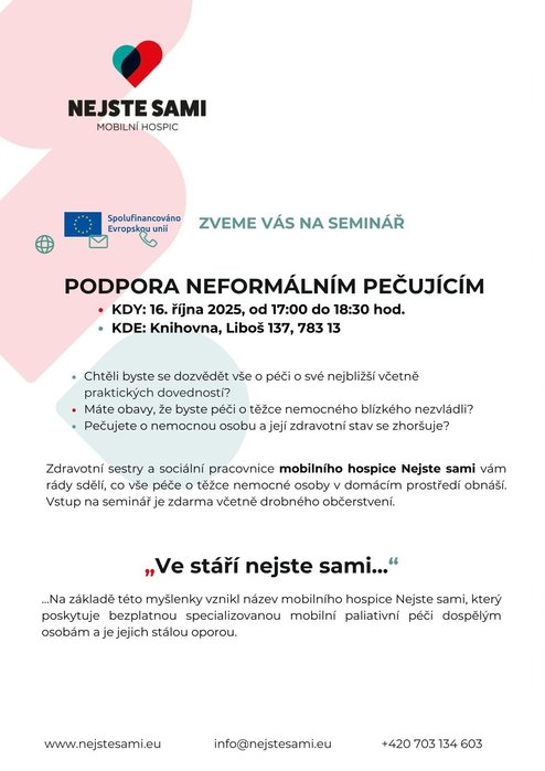 Úvod > Obec > Aktuality > SEMINÁŘ - NEJSTE SAMI - PODPORA NEFORMÁLNÍM PEČUJÍCÍM 16.10.2025 od 17 hod. KNIHOVNA