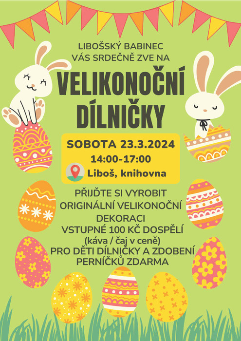 Spolek žen Liboš Vás srdečně zva na VELIKONOČNÍ DÍLNIČKY v sobotu 23.března 2024 od 14:00 do 17:00 hod v knihovně Liboš.